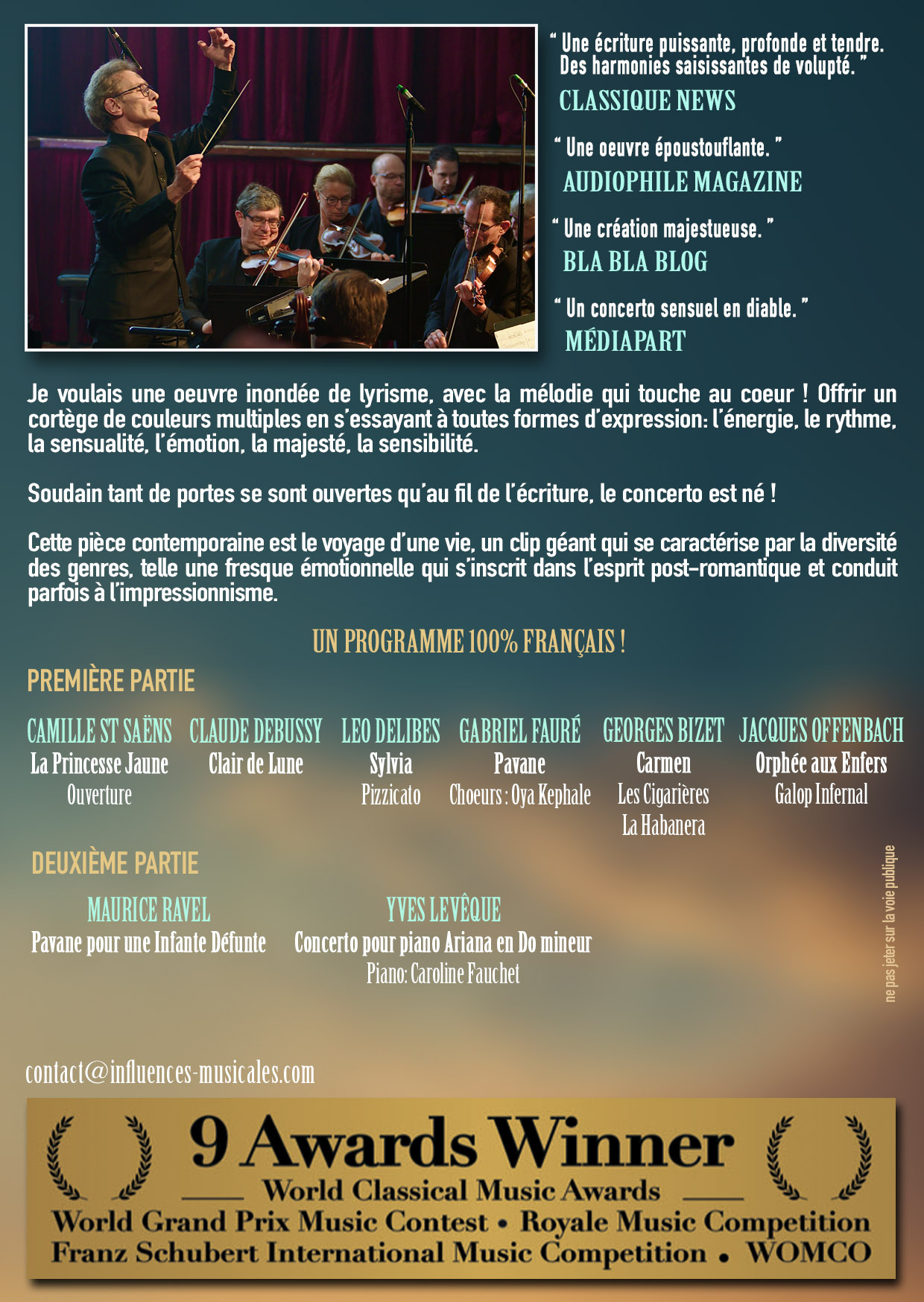 Plongez dans un voyage musical envoûtant avec le concerto pour piano ARIANA d’Yves LÉVÊQUE, interprété par Caroline FAUCHET et l’Orchestre Colonne, sous la direction de Julien LEROY.